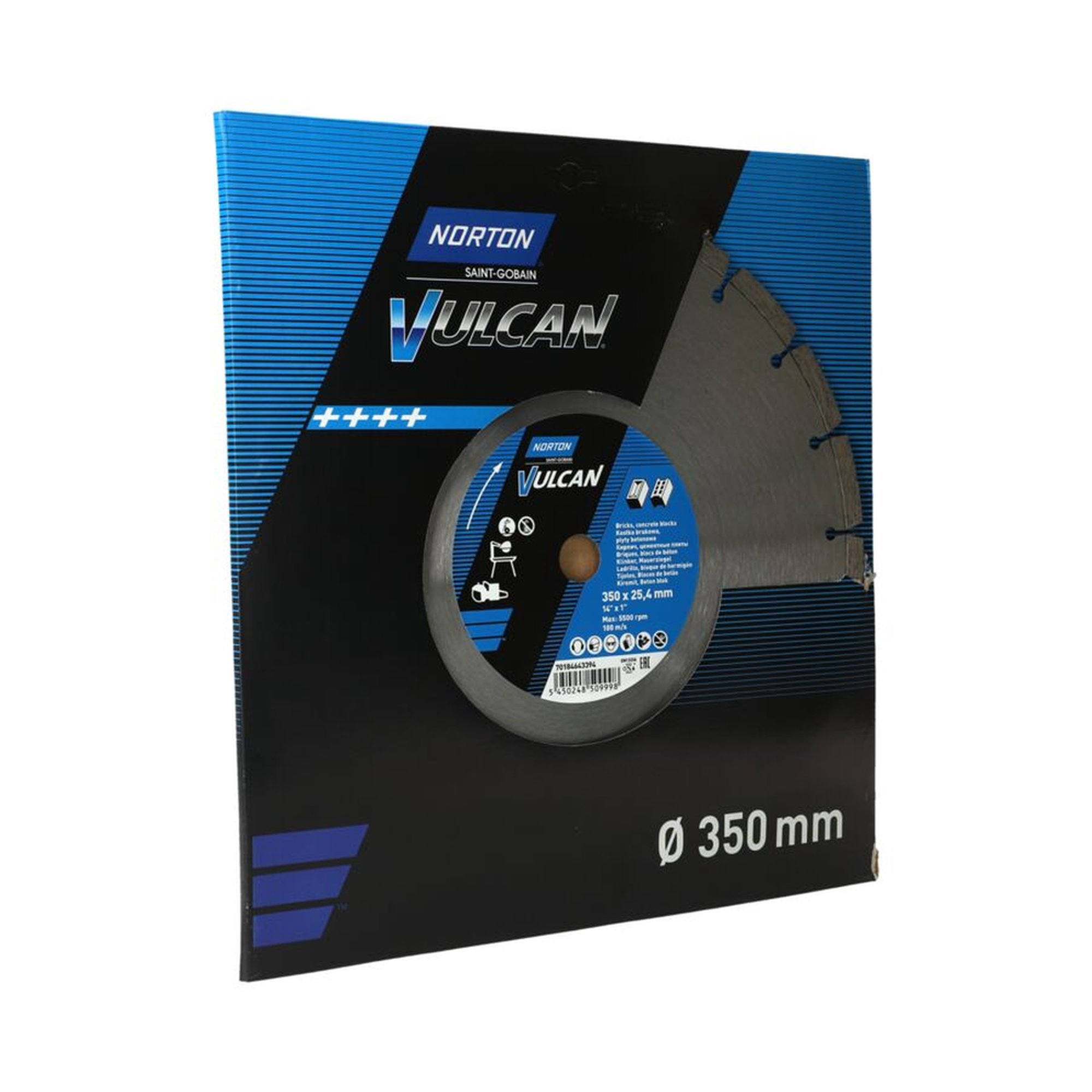 Die Norton Vulcan VULCAN UNI Diamantscheibe mit den Maßen 350x25.4mm ist eine vielseitig einsetzbare Lösung für professionelle Schneidarbeiten im Baugewerbe. Diese hochwertige, gesinterte, segmentierte Diamantscheibe wurde speziell dafür entwickelt, eine breite Palette von Baumaterialien effizient zu durchtrennen, darunter Betonrohre, Betoneinfassungen, Dachpfannen, mittlere Pflastersteine und Betonpflasterplatten.
