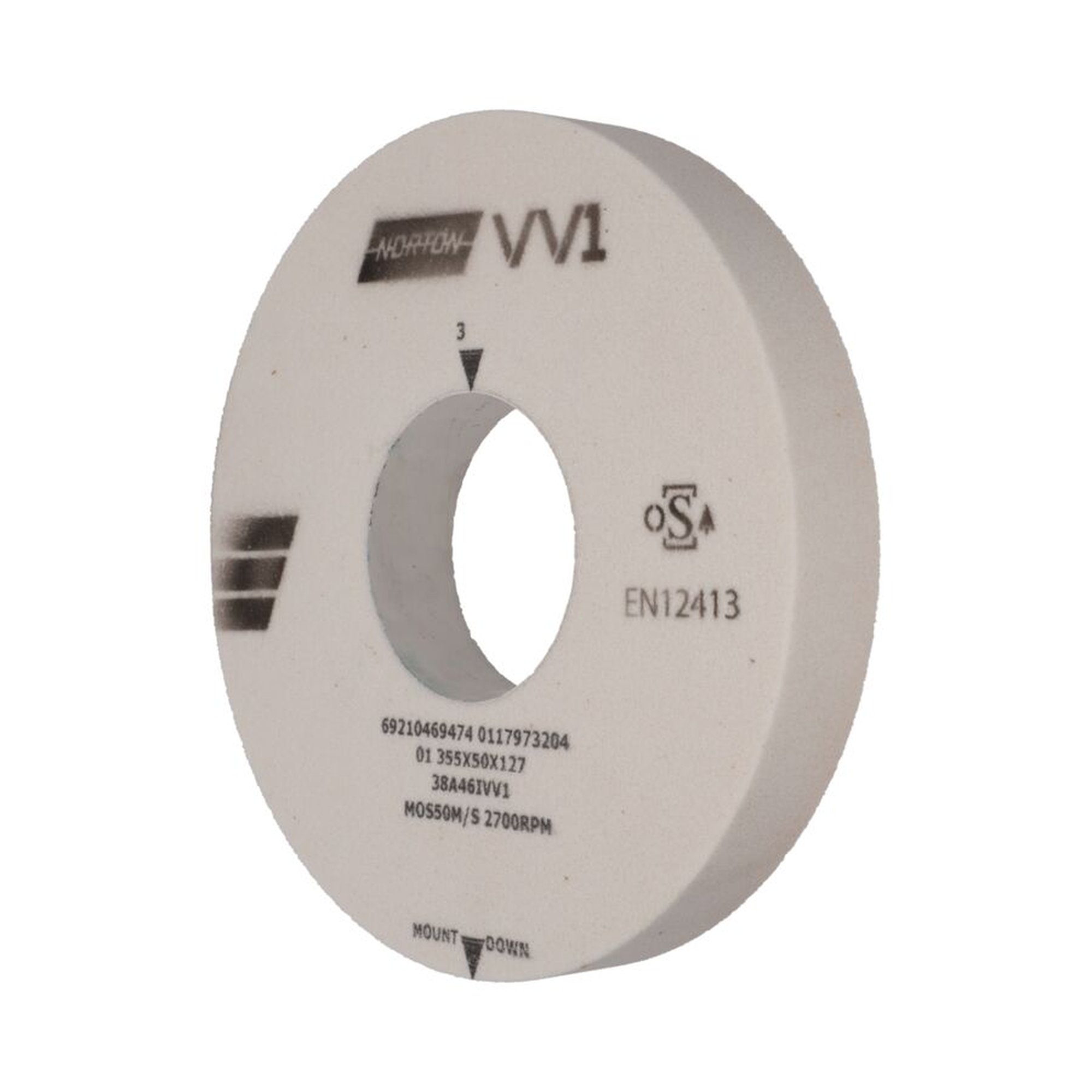 Die Dimensionen der Scheibe mit einem Durchmesser von 355 mm, einer Breite von 50 mm und einem Lochdurchmesser von 127 mm machen sie kompatibel mit zahlreichen Rundschleifmaschinen. Die konkrete Artikelnummer 38A46IVV1 weist auf die spezifische Formel der Scheibe hin, die in der Herstellung von Norton für höchste Präzision und Effizienz entwickelt wurde.
