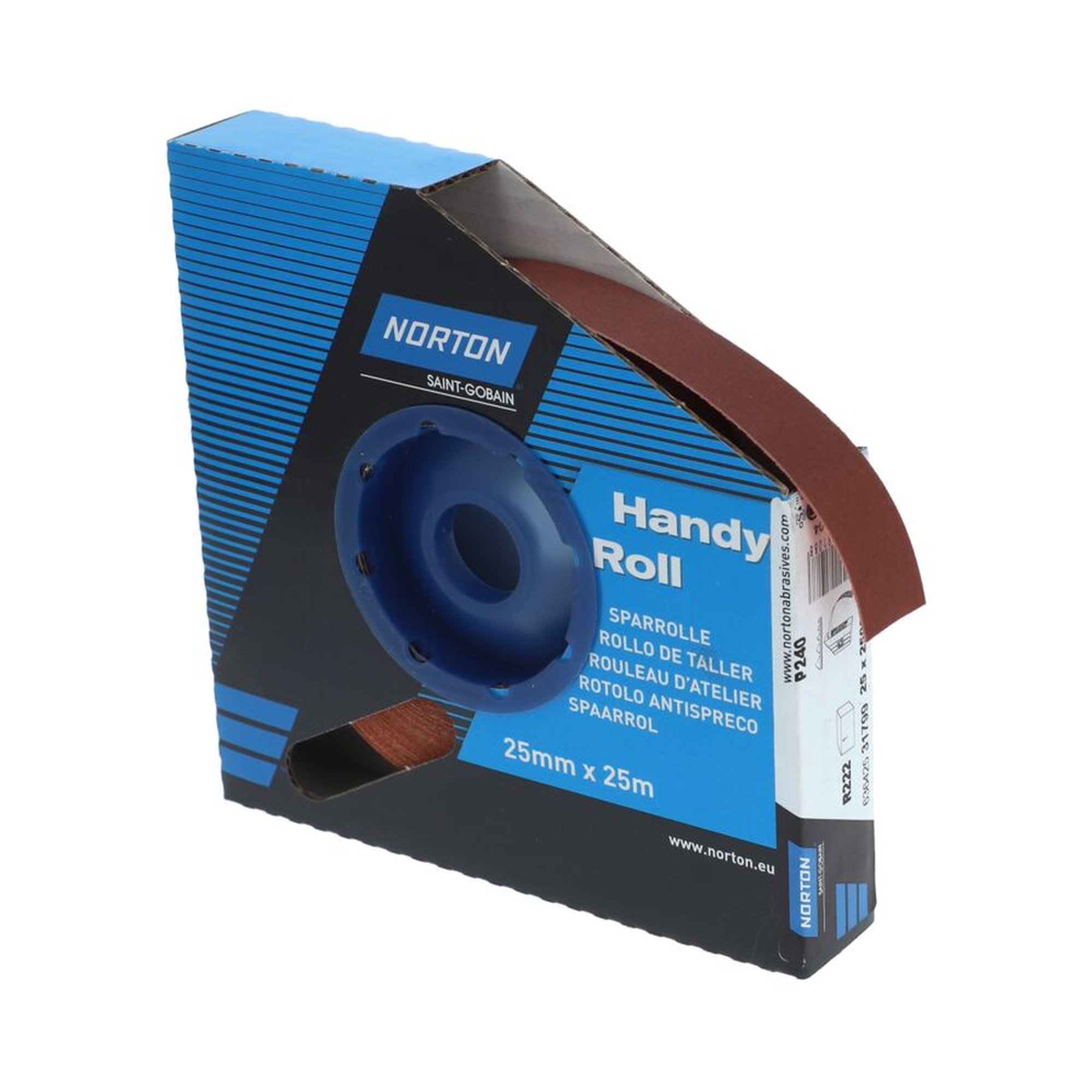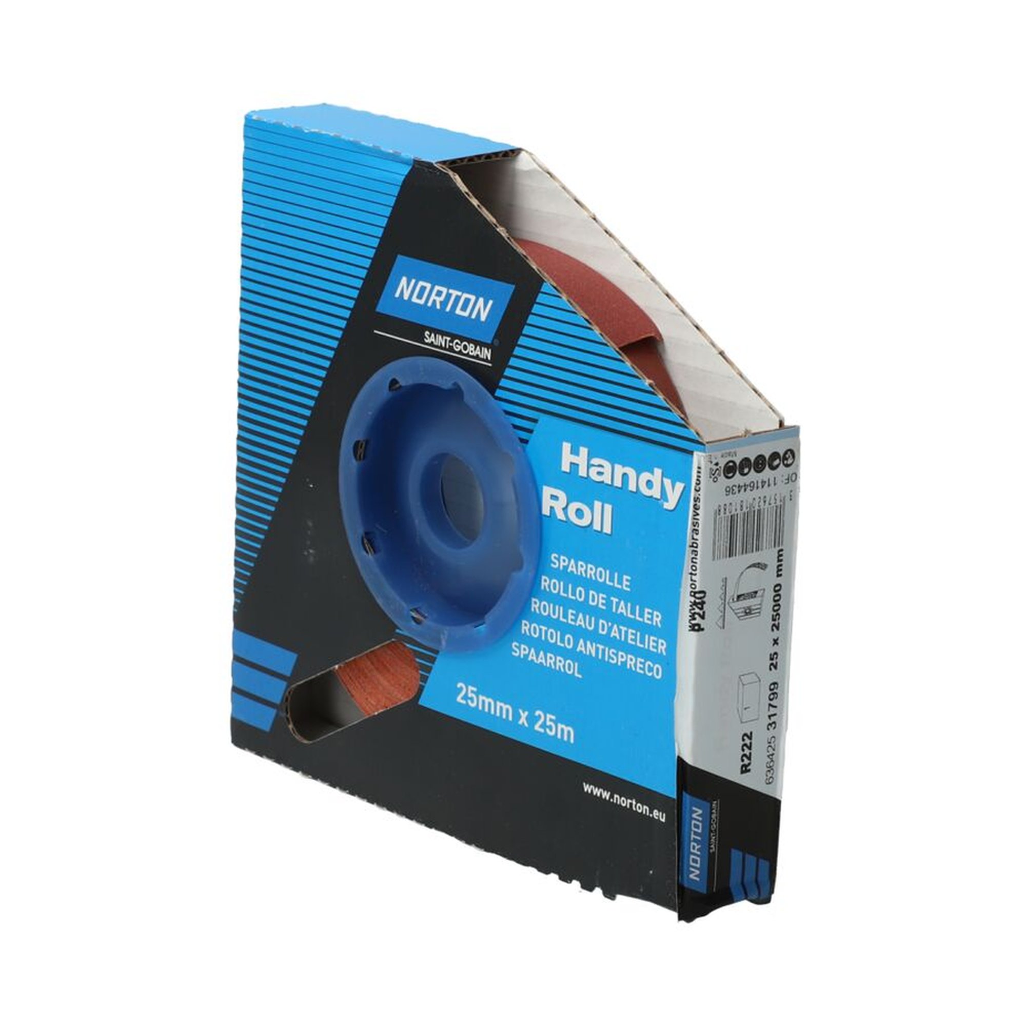 Hochwertige Norton R222 Schleifrollen, 25mm x 25000m, K240, für effizientes Schleifen von Holz und Metall. Einfach abreißbar, in praktischer Spenderbox für Schutz und minimierten Abfall.,