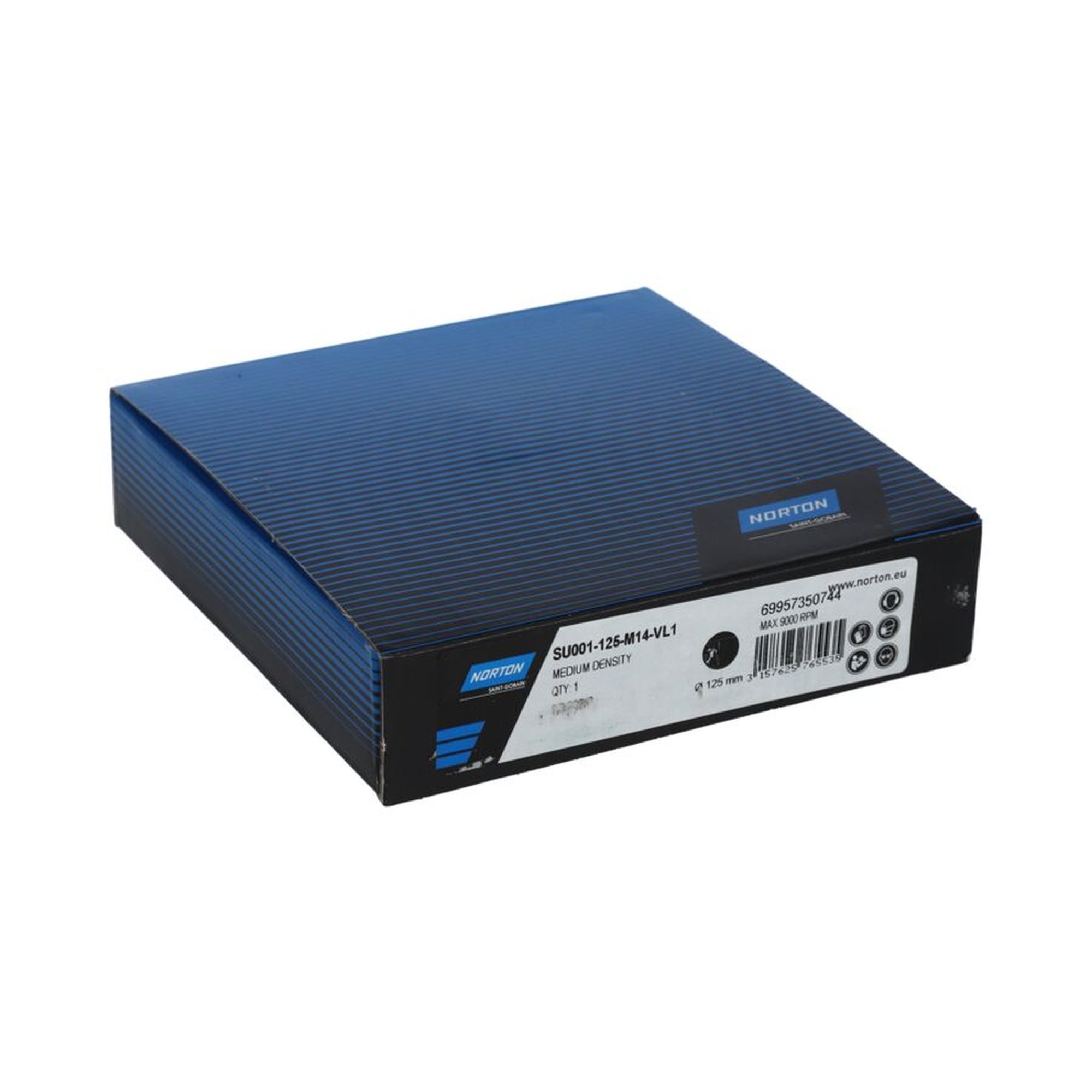 Hochwertiger 125mm Stützteller mit Klettverschluss von Norton PRO, inklusive vielseitigem Befestigungssystem und diversen technischen Schnittstellen-Pads. Ideal für vielfältige Schleifarbeiten in Industrie und Handwerk.,