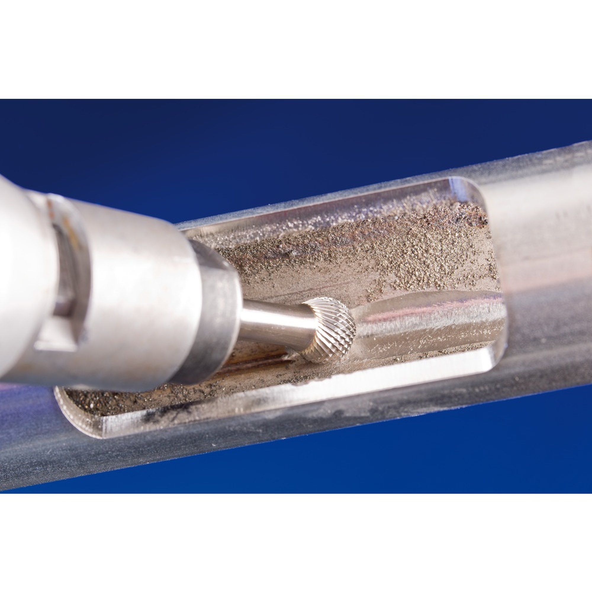 Mit seinem kugelförmigen Design ermöglicht der Frässtift eine hohe Oberflächengüte und eine präzise Bearbeitung. Er eignet sich besonders gut für das Entgraten, das Fräsen von Konturen und das Erzeugen von Hinterschnitten.