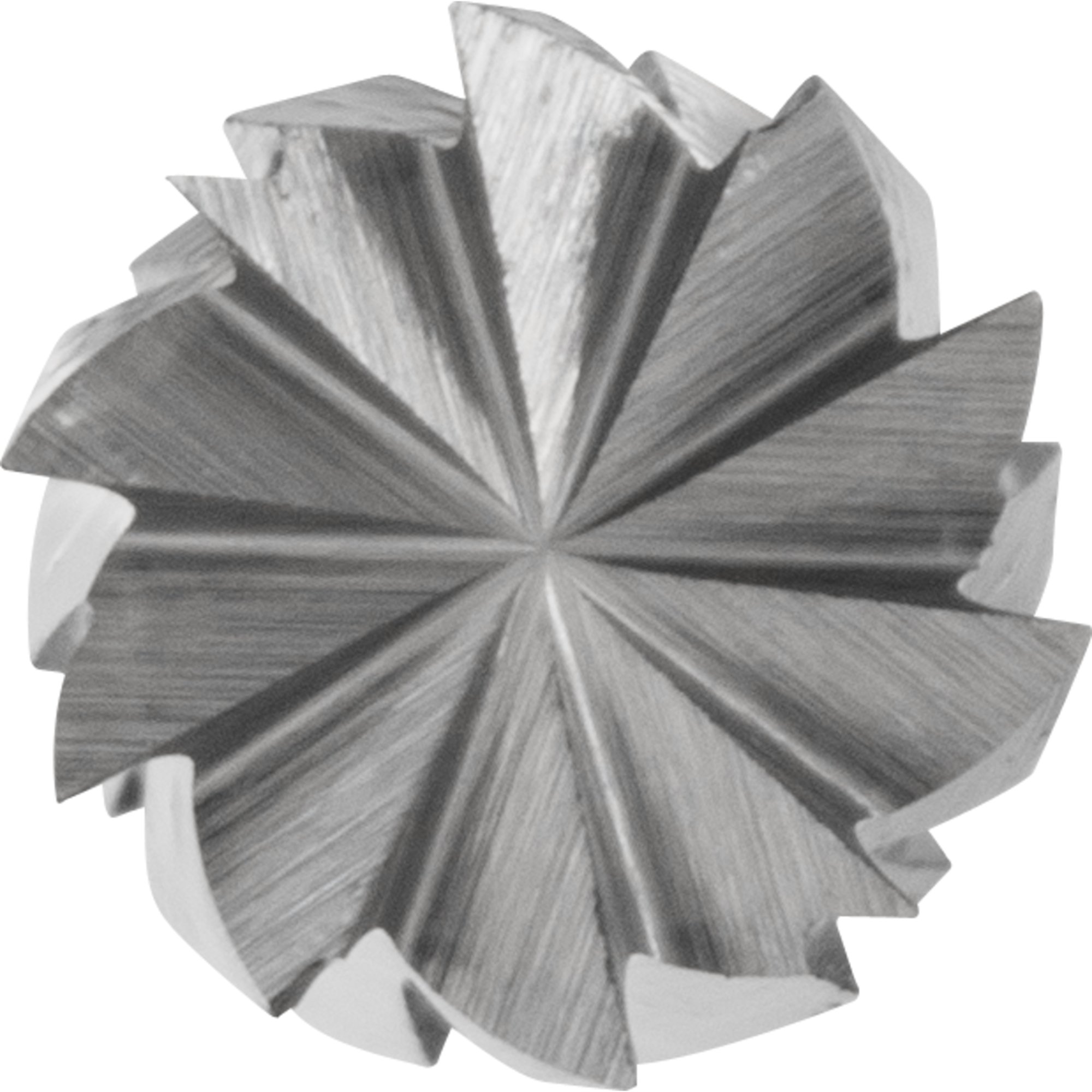 Die stumpfkegelförmige Ausführung des Frässtifts ermöglicht eine besonders gute Zugänglichkeit und eine hohe Flexibilität bei der Bearbeitung von Werkstücken. Durch die Verjüngung zum Schaft hin wird eine hohe Stabilität und eine gute Führung gewährleistet.