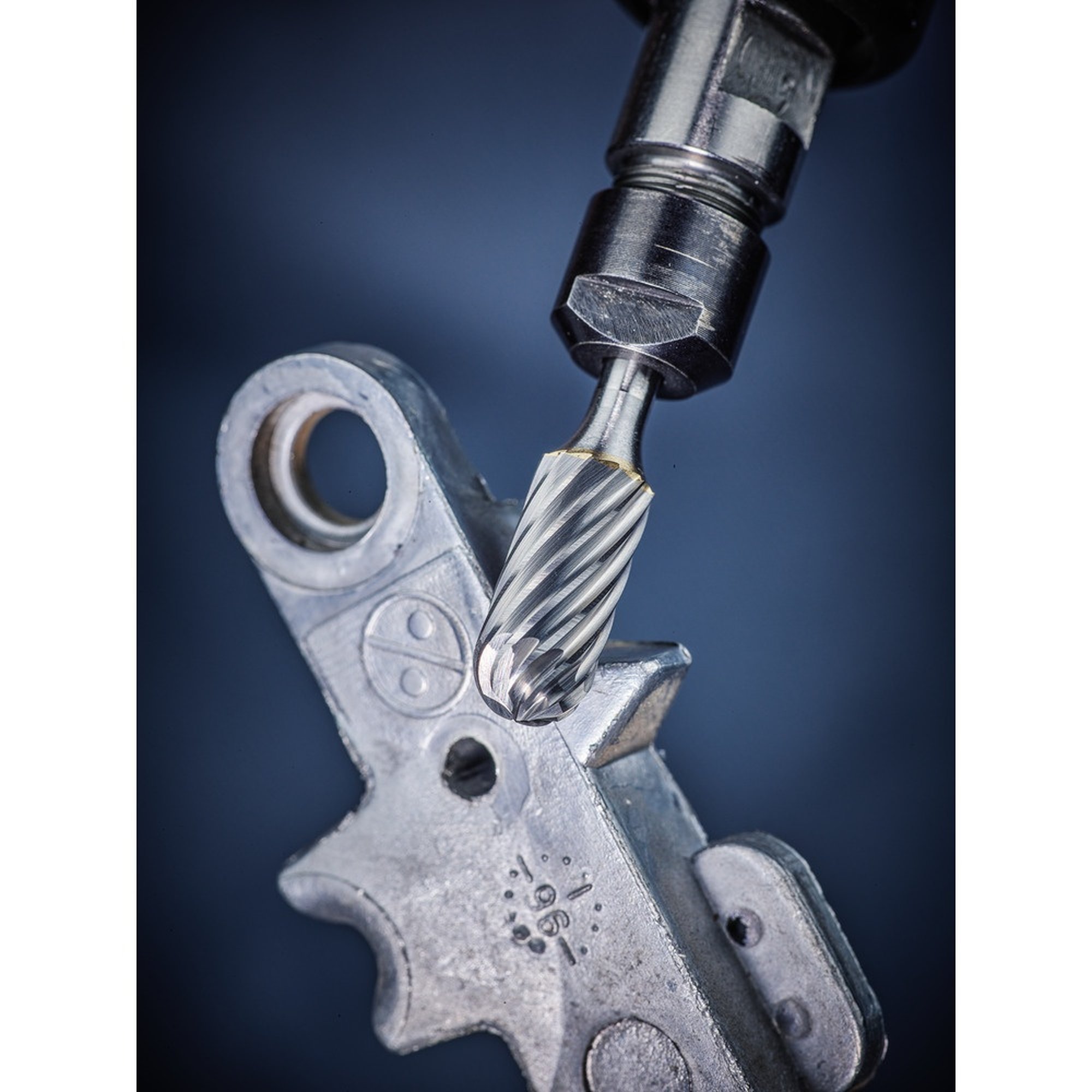 Dank dieser speziellen Formgebung eignet sich der Frässtift besonders gut für die Bearbeitung von Konturen und Radien. Er ermöglicht präzise und saubere Ergebnisse, auch bei schwierigen Werkstücken.