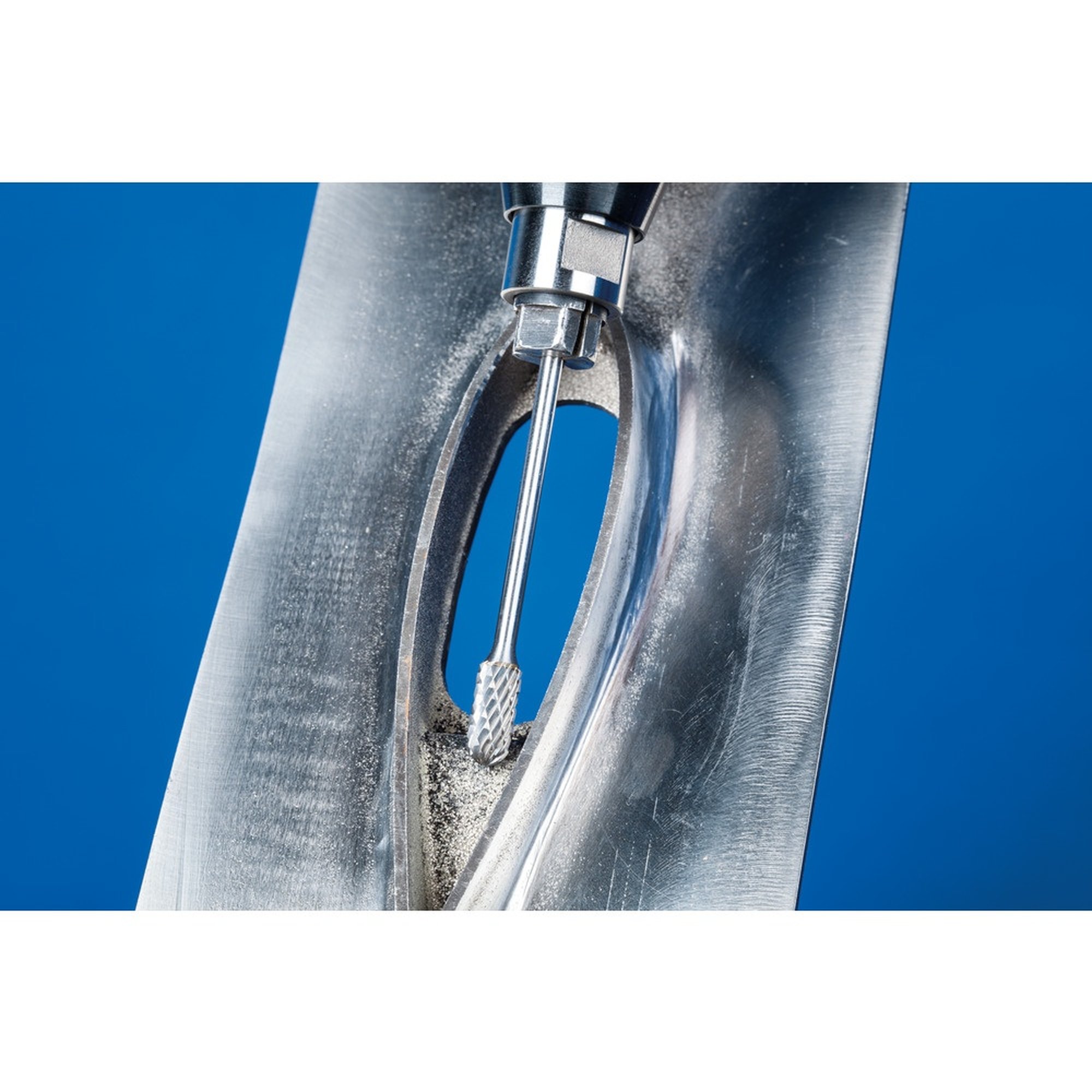 Dank der Verzahnung nach DIN 8033 bietet der HM-Frässtift eine optimale Spanabfuhr und verhindert ein Verklemmen des Werkstücks. Dies ermöglicht ein effizientes und präzises Arbeiten. Die Zahnung mit 5 Zähnen pro Zentimeter sorgt für eine hohe Schneidleistung und eine glatte Oberfläche des bearbeiteten Materials.