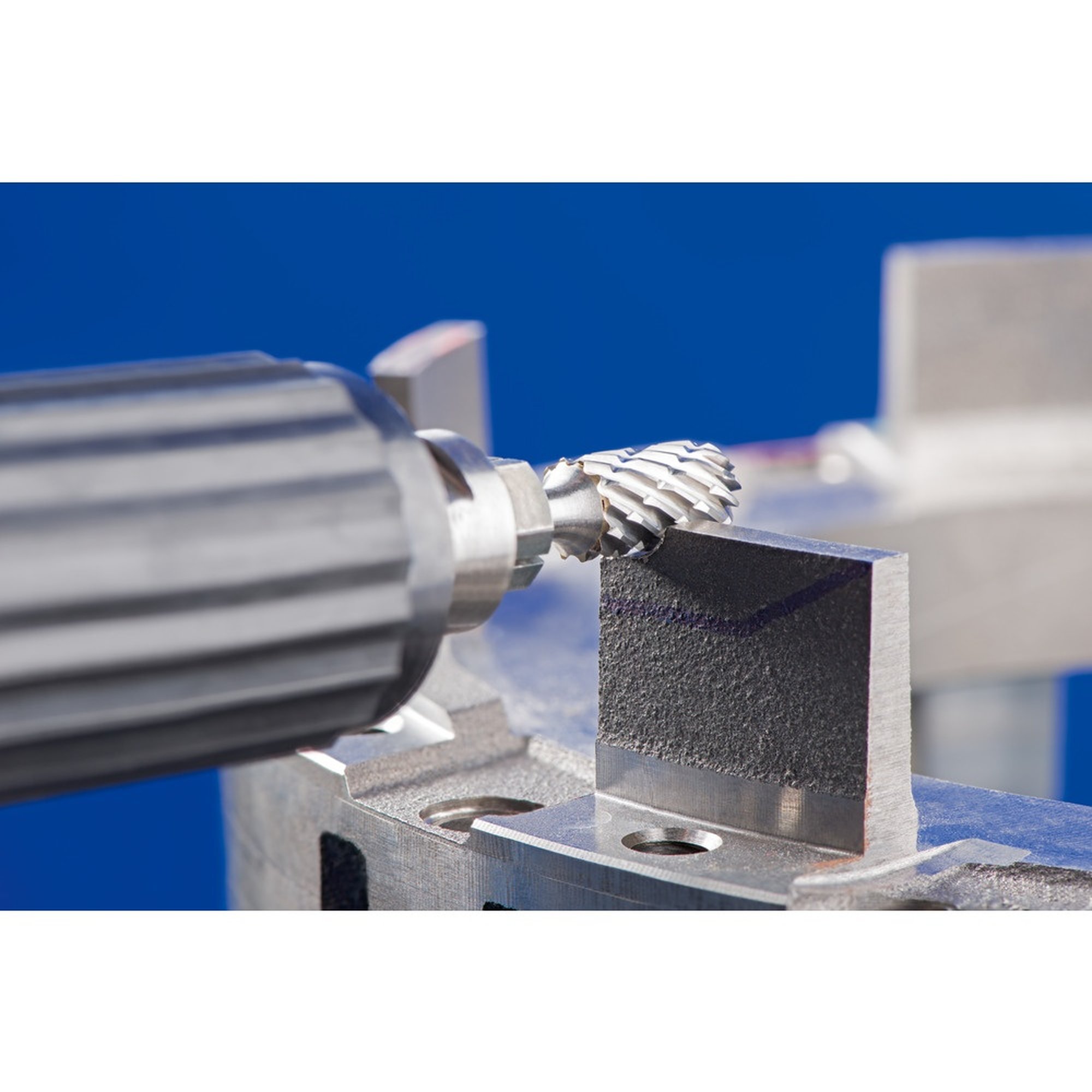 Merkmale: Hochwertiger walzenrundförmiger Frässtift nach DIN 8032 mit einer einzigartigen Kombination aus zylindrischen und kugelförmigen Geometrien. SL = 6 mm Stahllangschaft für optimale Handhabung und Kontrolle
