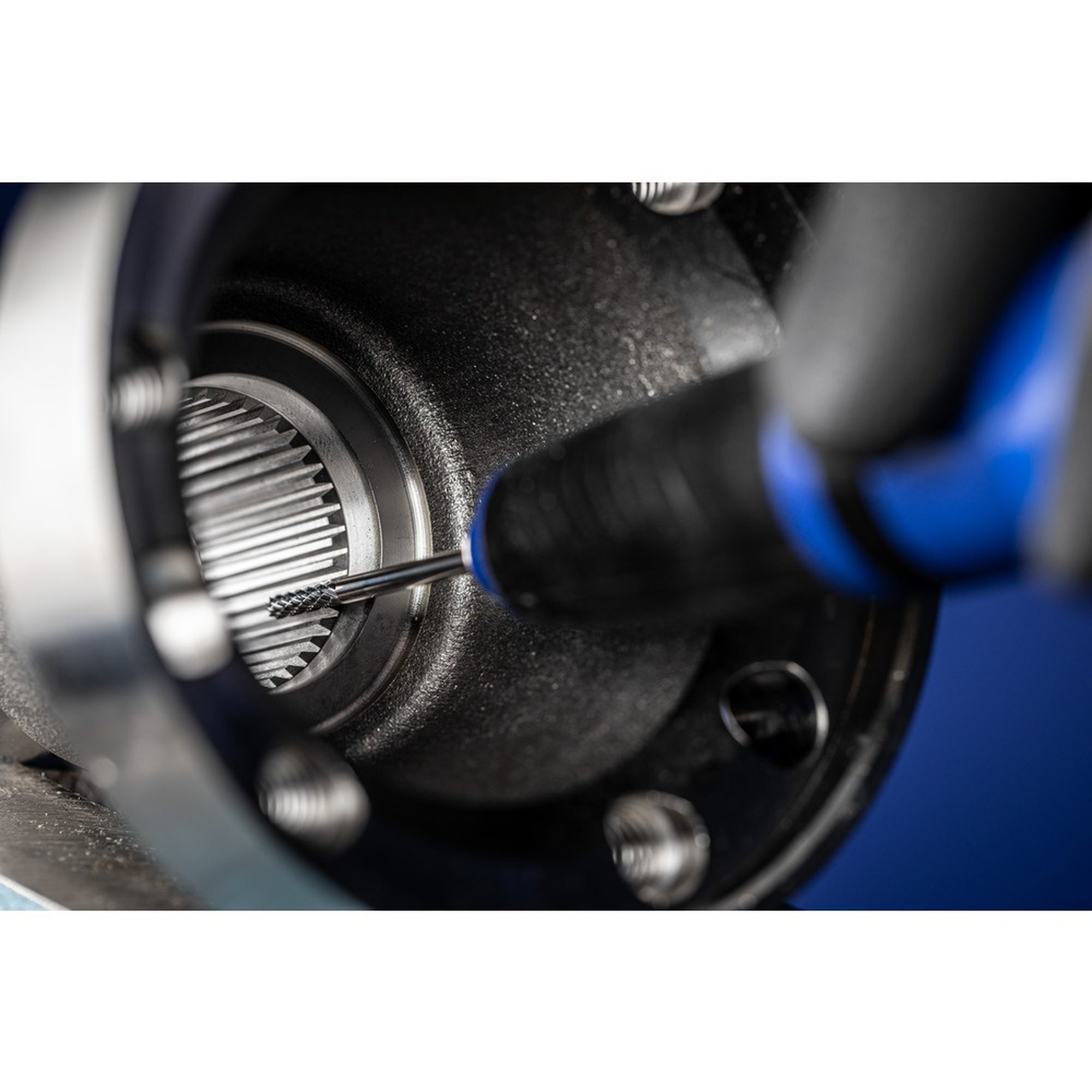 Die Form ZYAS des Frässtifts ermöglicht eine vielseitige Anwendung. Er eignet sich sowohl für das Fräsen von Konturen als auch für das Entgraten von Kanten. Durch die Verzahnung auf Umfang und Stirn ist er in der Lage, sowohl in axialer als auch in radialer Richtung zu fräsen.