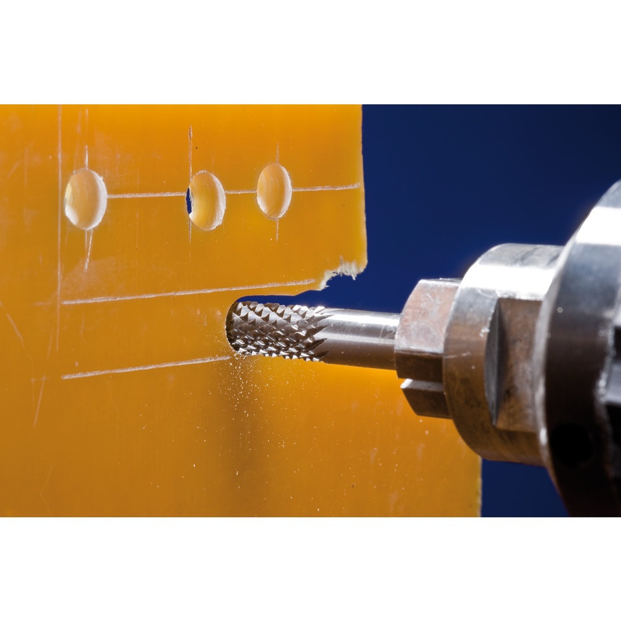 Zusätzlich ist der Frässtift mit ZBS-Schneiden ausgestattet, die eine hohe Schneidleistung und eine gute Spanabfuhr gewährleisten. Sie ermöglichen eine schnelle und effiziente Materialabtragung, ohne dass es zu Verstopfungen oder Überhitzungen kommt.