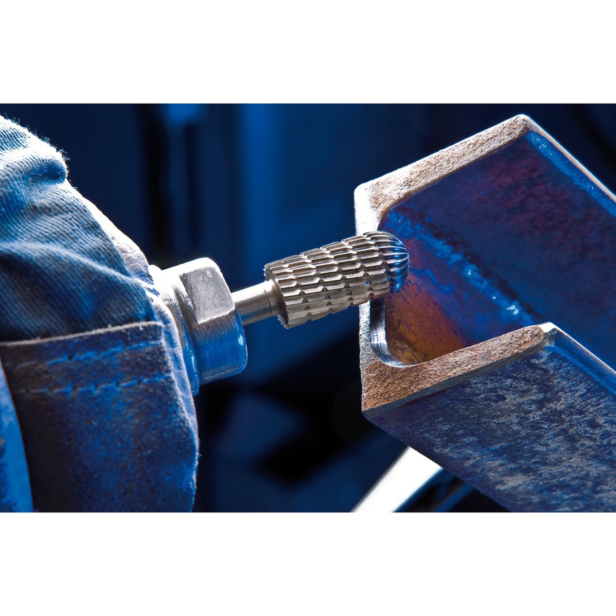 Dank seiner walzenrundförmigen Form kann dieser Frässtift sowohl zum Planfräsen als auch zum Konturfräsen verwendet werden. Er eignet sich besonders gut für das Entfernen von Material und das Erzeugen von glatten Oberflächen.