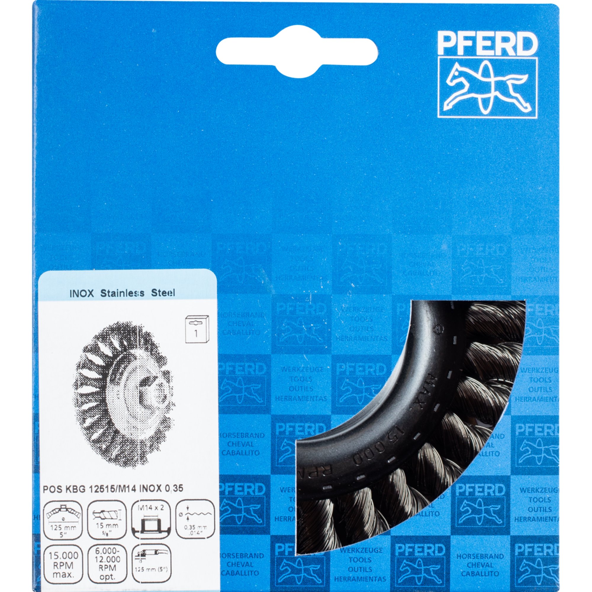 Die PFERD Kegelbürste mit Gewinde, gezopft POS KBG 12515/M14 INOX 0,35 ist eine aggressiv arbeitende Bürste, die sich hervorragend für schwere Bürstarbeiten wie Entgraten, Reinigen und Entrosten eignet. Mit ihrem Gewinde und dem Durchmesser von 125 mm ist sie einfach zu montieren und passt auf alle handelsüblichen Winkelschleifer.