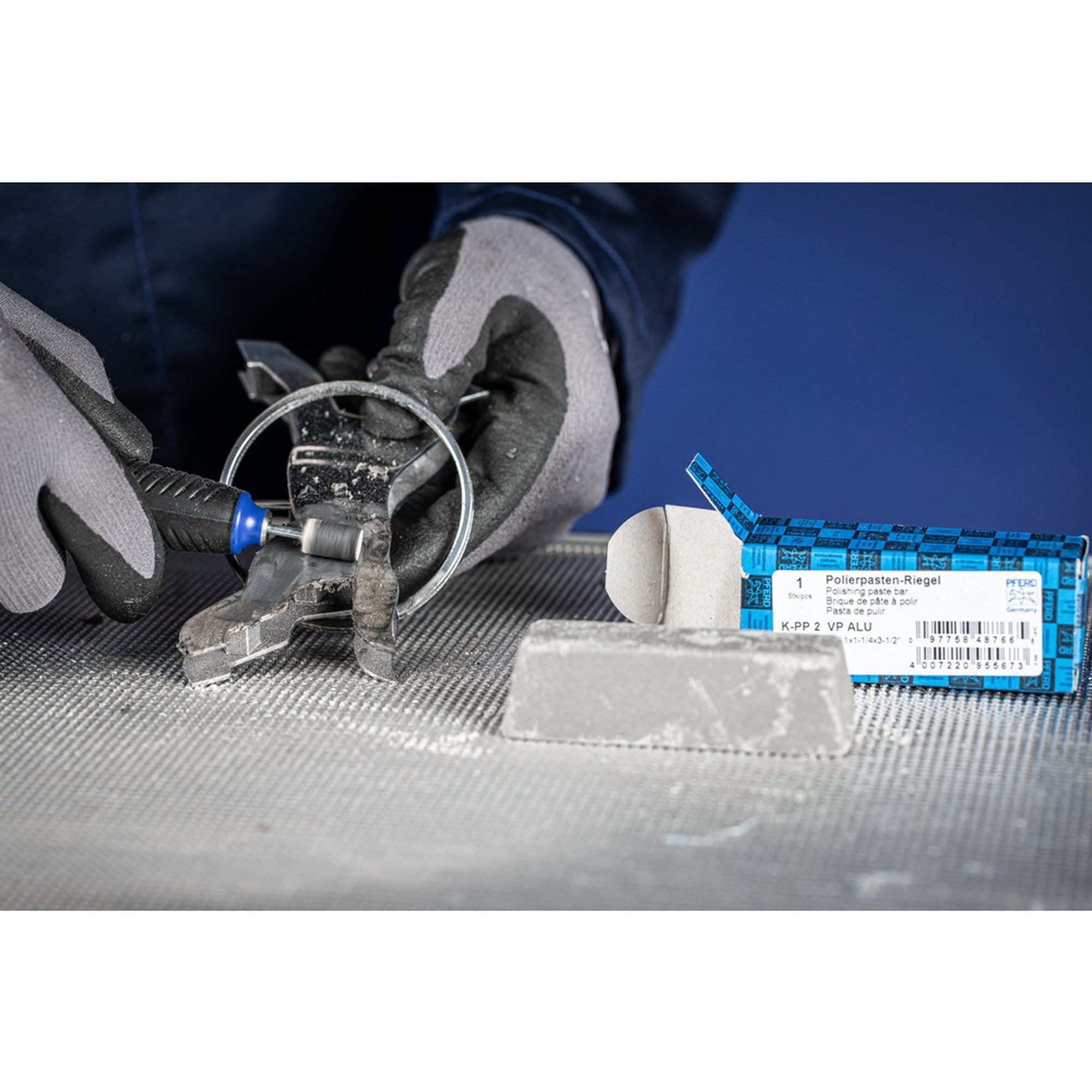 Besonderheiten: Der PFERD Polierpasten-Riegel G-PP 2 VP ALU bietet vielseitigen Einsatz bei der Vor- und Hochglanzpolitur. Er kann sowohl mit Filzwerkzeugen als auch mit Tuchringen verwendet werden, um eine äußerst glatte Oberfläche zu erzielen