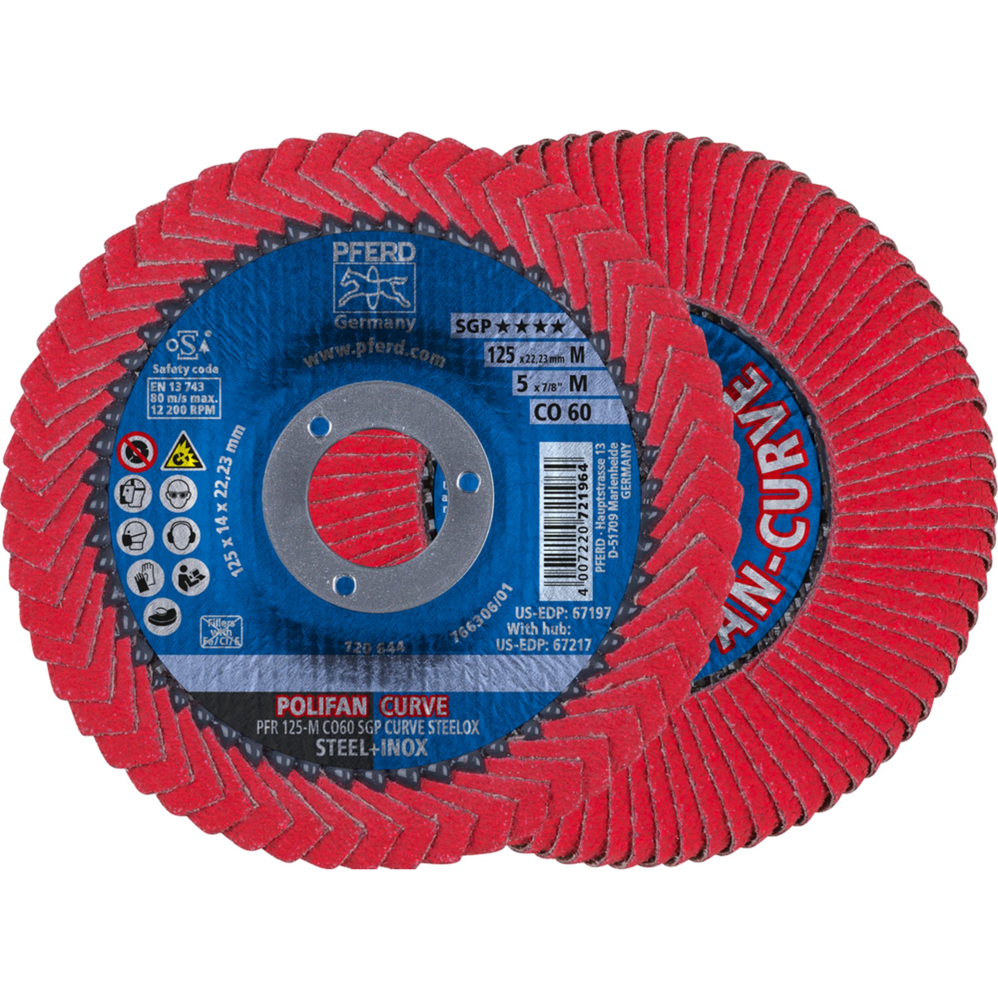 Merkmale: Die PFERD POLIFAN-Fächerscheibe PFR 125-M Z 40 SGP CURVE STEELOX ist eine Hochleistungsfächerscheibe, die speziell für den maximalen Materialabtrag auf Stahl und Edelstahl (INOX) entwickelt wurde