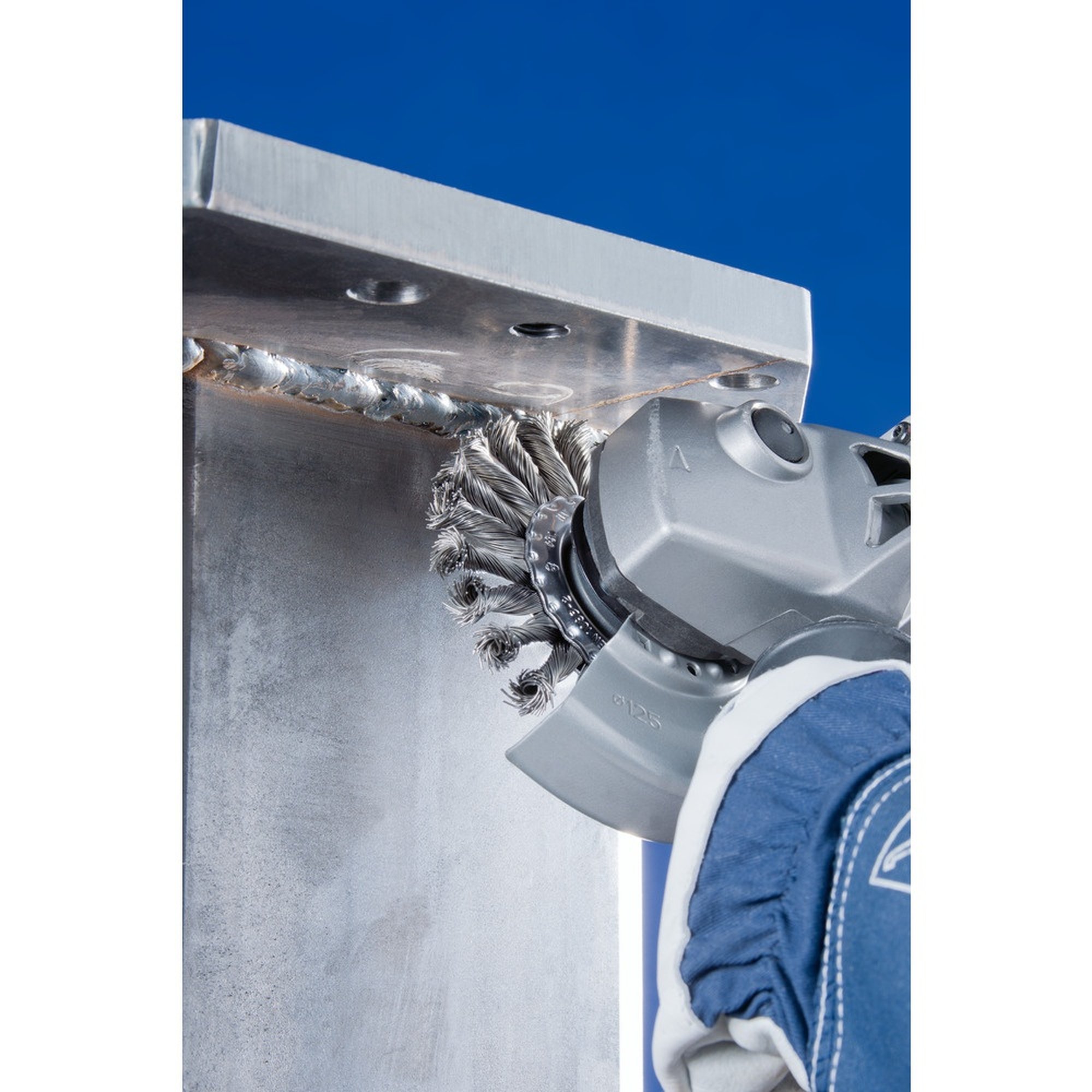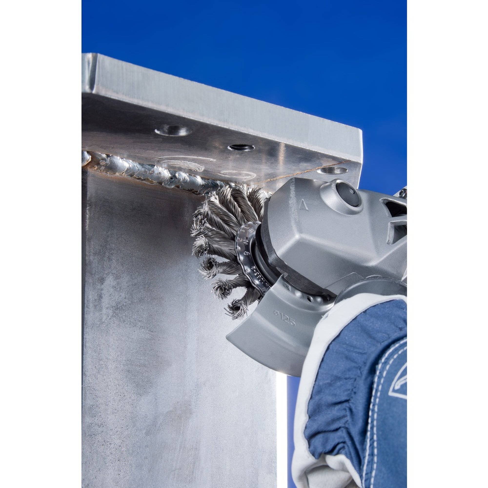 Die Bürste ist mit einem M14-Gewinde ausgestattet und hat einen Durchmesser von 125 mm. Sie besteht aus hochwertigem Stahldraht, der in einem speziellen Verfahren gezopft wurde, um eine besonders hohe Aggressivität zu erreichen.